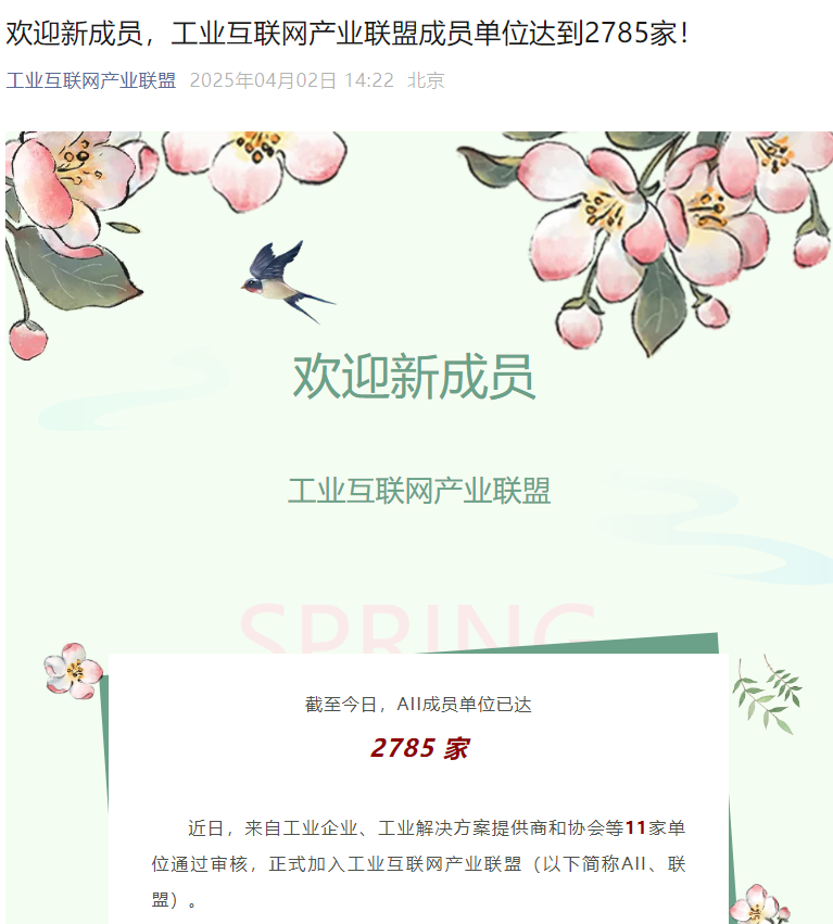 2025 年 4 月 2 日,工業互聯網產業聯盟(AII)宣布,青島中電綠網新能源有限公司成功通過審核,正式成為聯盟新成員。這標志著青島中電綠網新能源有限公司在工業互聯網領域獲得權威認可,開啟發展新征程。